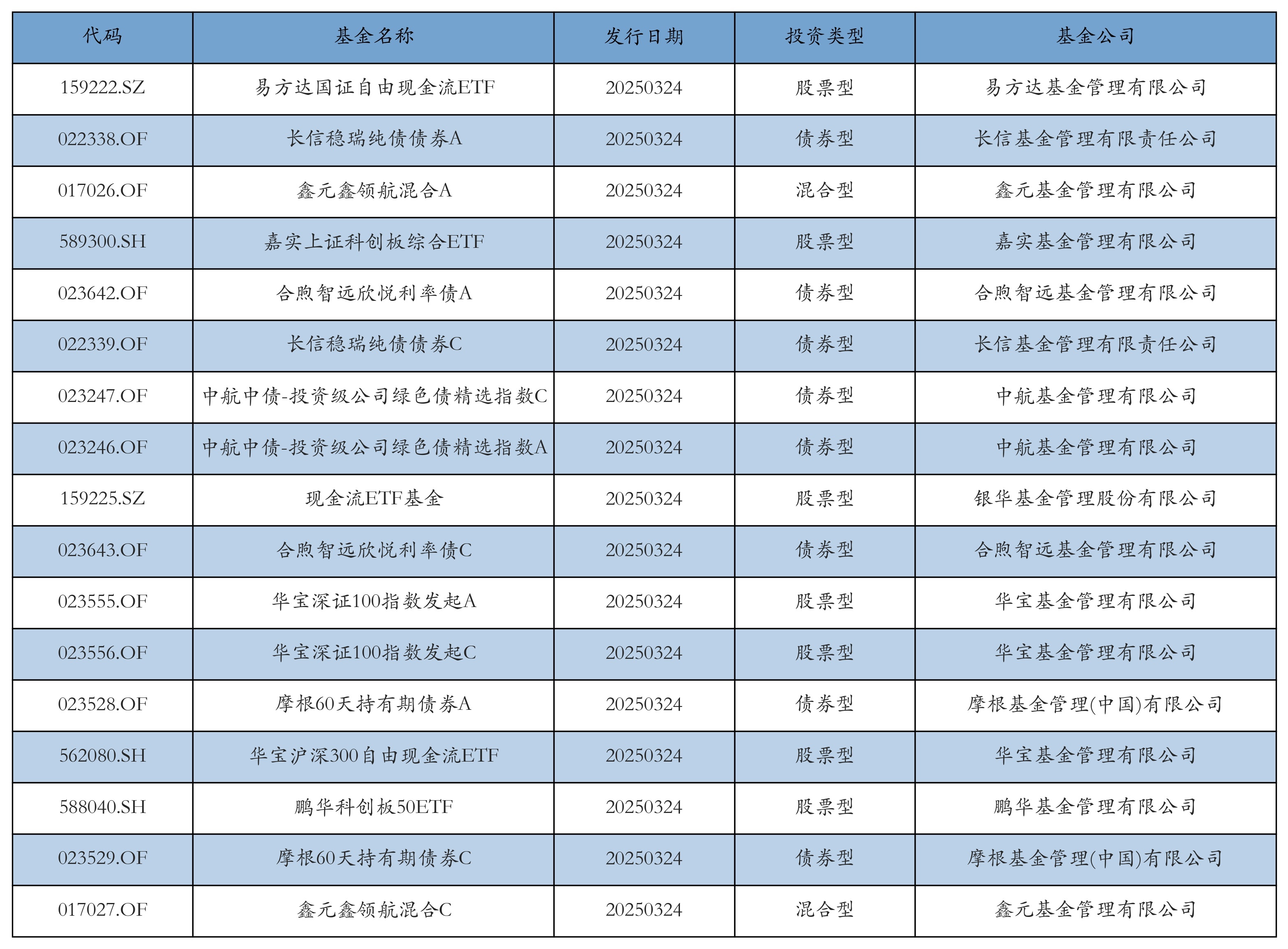 昨日有17只新基金发行,分别为:易方达国证自由现金流ETF、长信稳瑞纯债债券A、鑫元鑫领航混合A、嘉实上证科创板综合ETF、合煦智远欣悦利率债A、长信稳瑞纯债债券C、中航中债-投资级公司绿色债精选指数C、中航中债-投资级公司绿色债精选指数A、现金流ETF基金、合煦智远欣悦利率债C、华宝深证100指数发起A、华宝深证100指数发起C、摩根60天持有期债券A、华宝沪深300自由现金流ETF、鹏华科创板50ETF、摩根60天持有期债券C、鑫元鑫领航混合C,详情见下表: