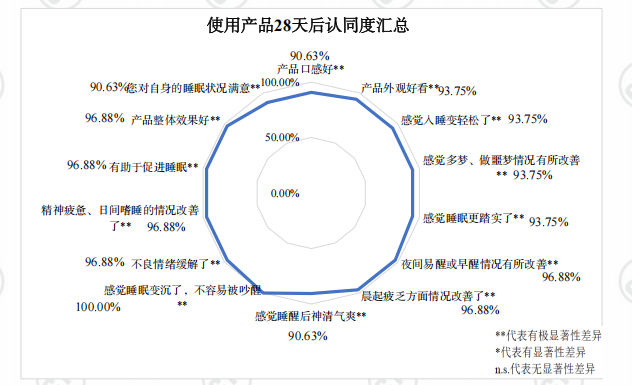 华测检测出具的28天人体试用报告为产品功效提供了权威背书。该试验选取32名30-59睡眠障碍受试者(其中 71.88% 为上班族),数据显示:连续 28 天饮用臻颜清·养后,入睡困难、夜间易醒早醒、做噩梦等睡眠问题均获显著改善,其中做噩梦情况减少 72.22%、入睡困难问题改善 50%,日间精力不足、困倦等状态优化超 60%,所有核心睡眠指标与使用前相比均呈现极显著性差异(P 值<0.001);产品 “有助于促进睡眠”“整体效果好”“睡醒后神清气爽” 等关键维度认同度均达 96.88%,全程无任何不良反应发生,充分验证了产品在助眠功效上的科学性、有效性与安全性。