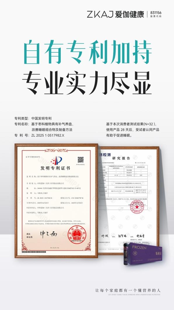 在消费升级与健康意识提升的双重驱动下,消费者对保健品的"天然性"与"科学性"提出了更高要求。爱伽健康推出的臻颜清·养产品,凭借专利技术的创新性、天然原料的安全性及权威数据的可信度,有望在气血睡眠养护细分市场形成差异化竞争优势。业内人士指出,该专利技术的落地不仅提升了品牌专业形象,更推动了枣科植物在功能性食品领域的高值化应用,为行业提供了"传统智慧+现代科技"的研发范本。