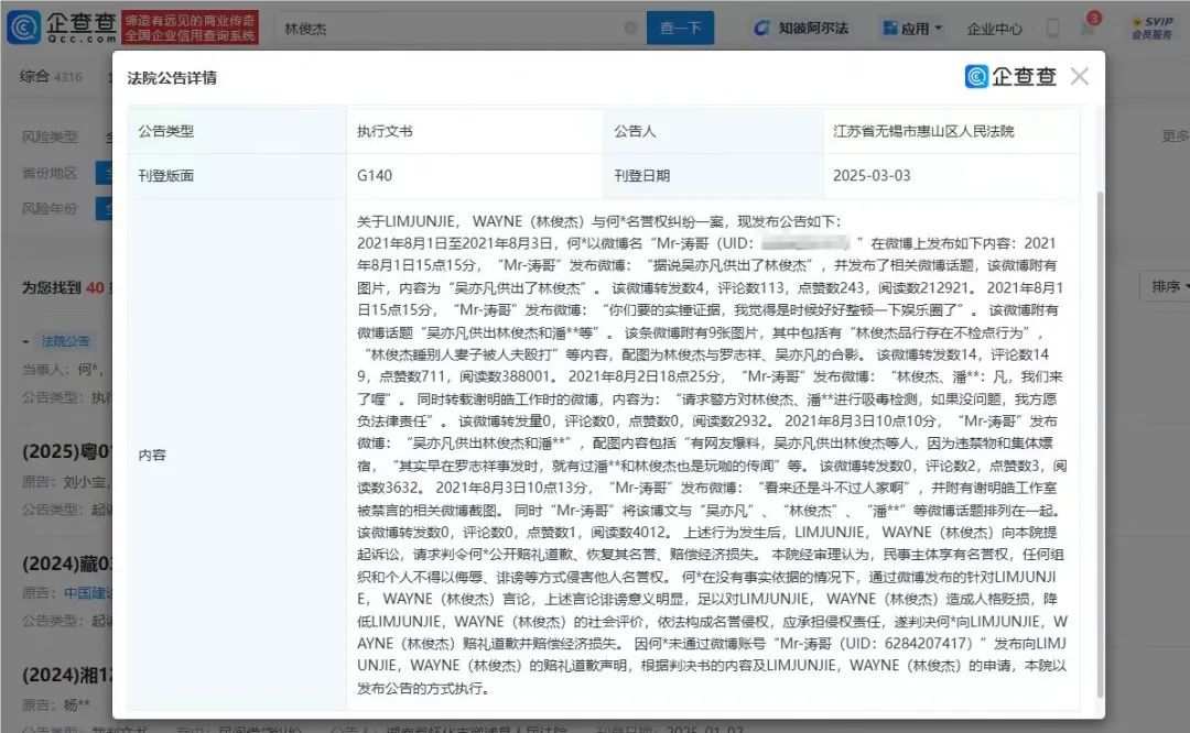 企查查APP显示,3月3日,何某因未通过涉案账号“Mr-涛哥”发布向LIMJUNJIE,WAYNE(林俊杰)的赔礼道歉声明,根据判决书的内容及LIMJUNJIE,WAYNE(林俊杰)的申请,法院以发布公告的方式执行。